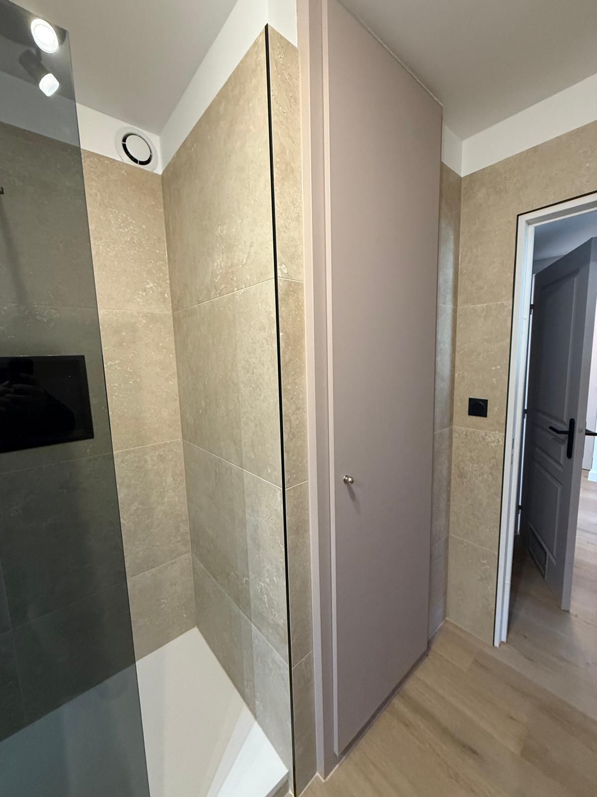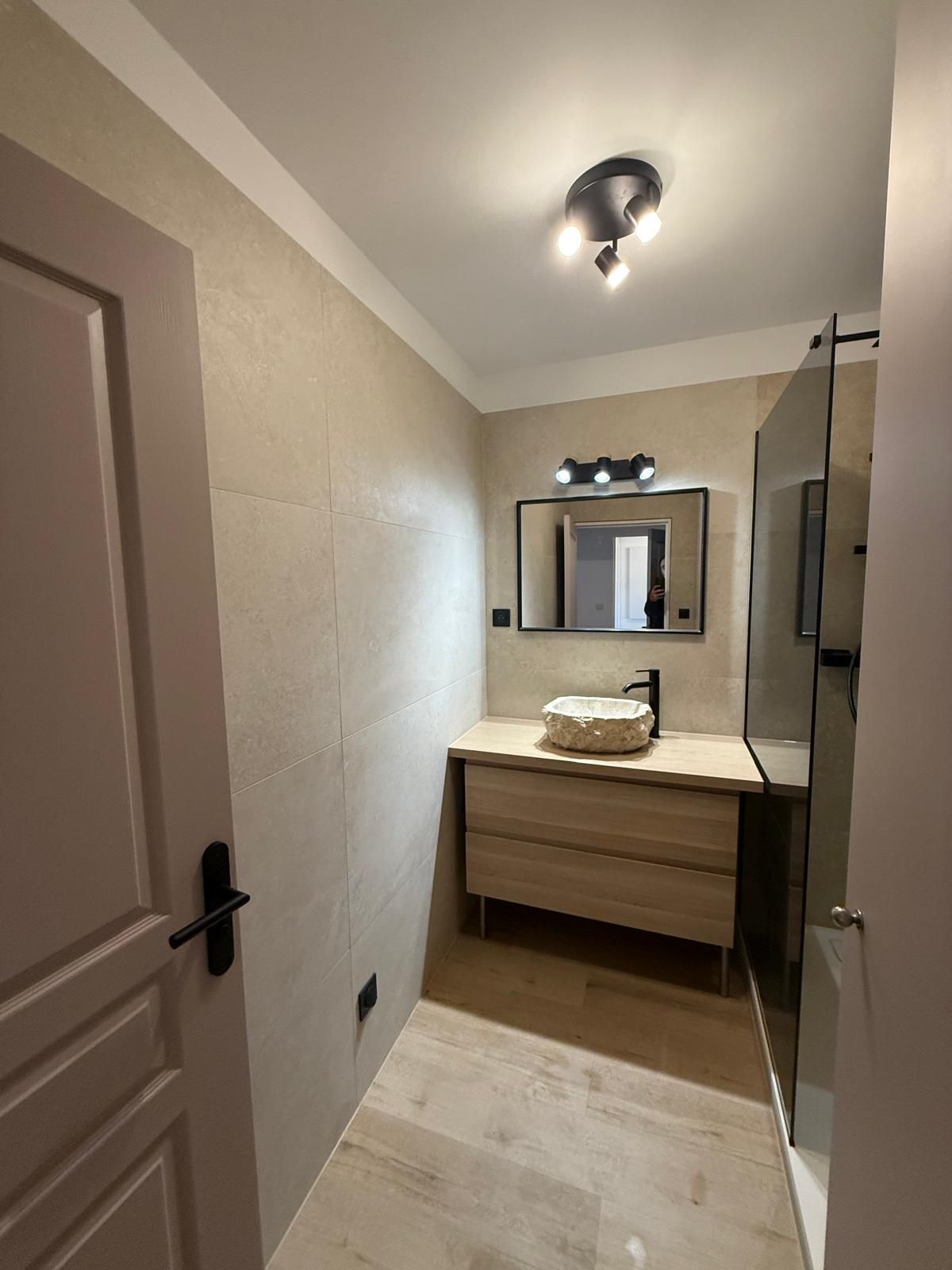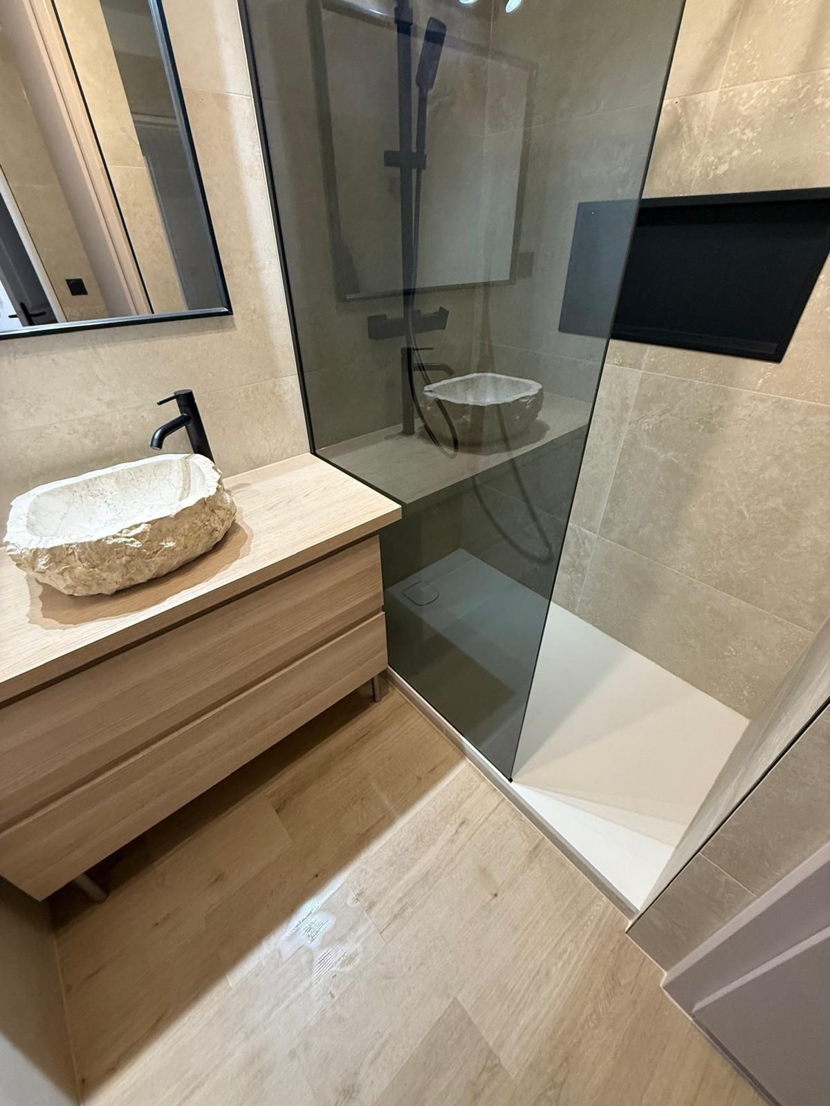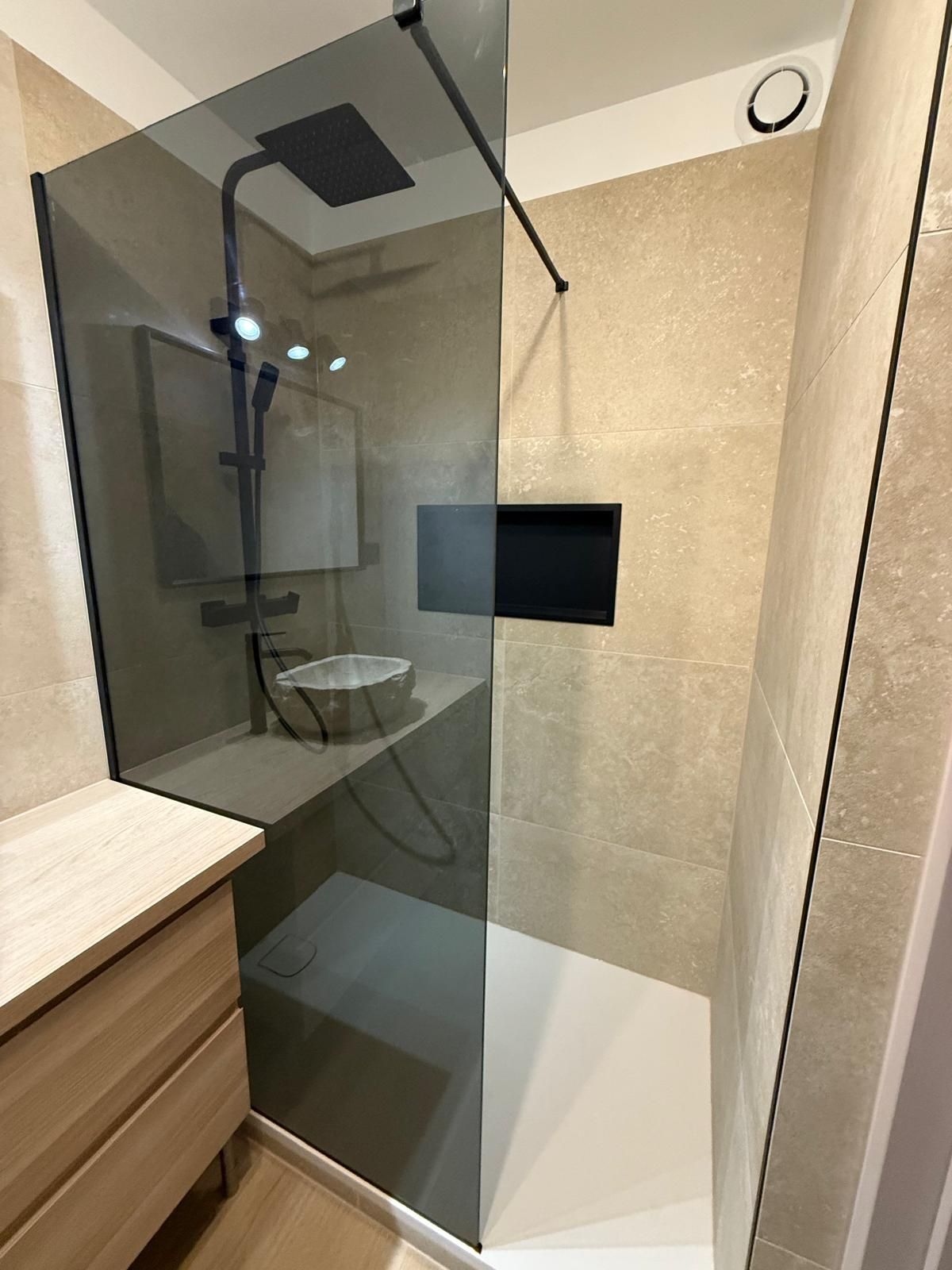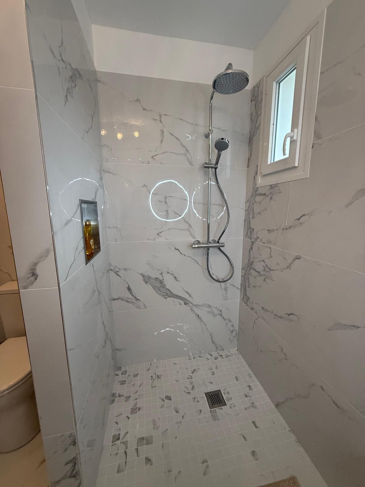 Nous transformons votre salle de bains de A à Z : dépose, pose de carrelage, étanchéité, agencement.