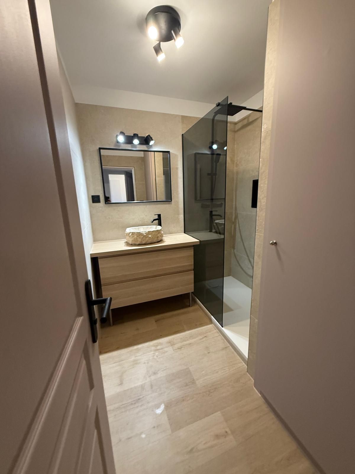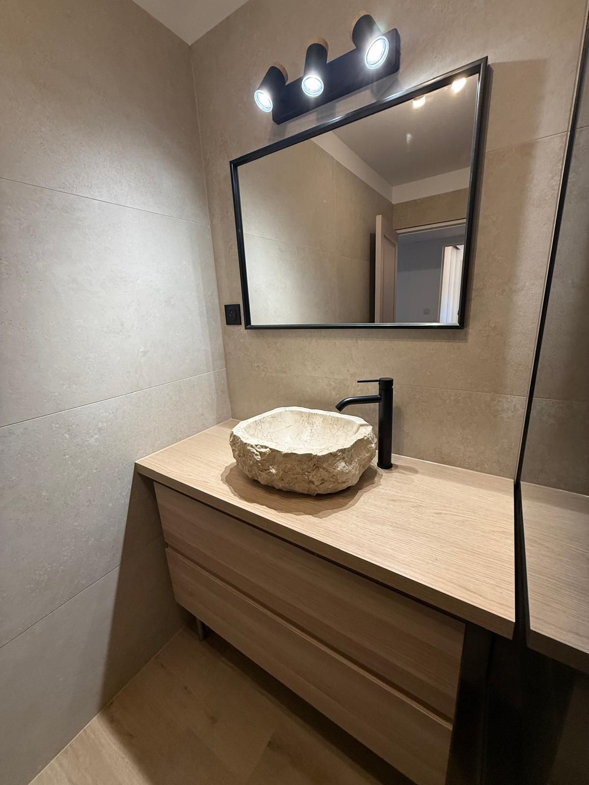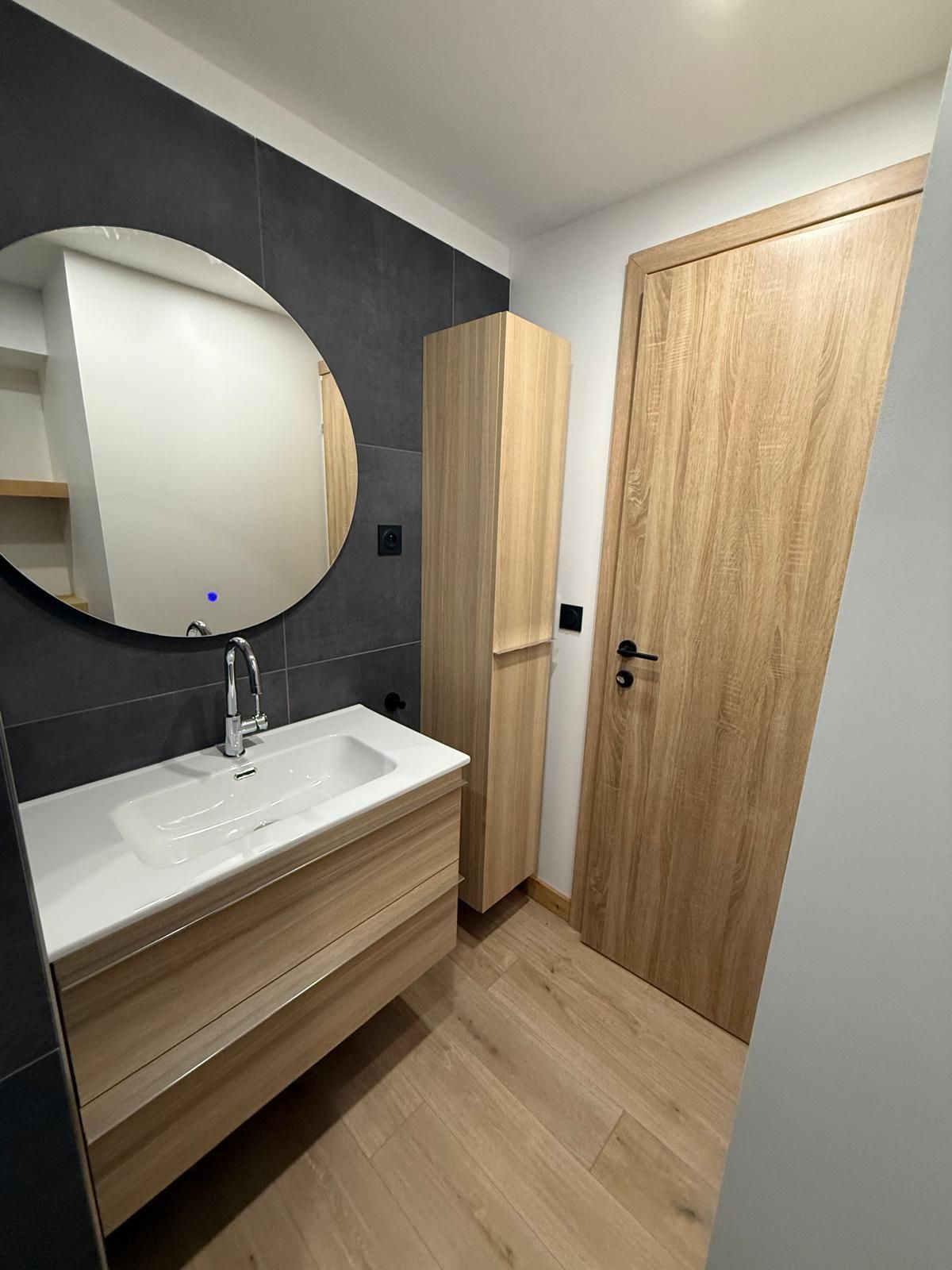 Nous aménageons votre salle d’eau selon vos envies, avec des rangements en bois astucieux et un design pensé pour votre confort au quotidien.
